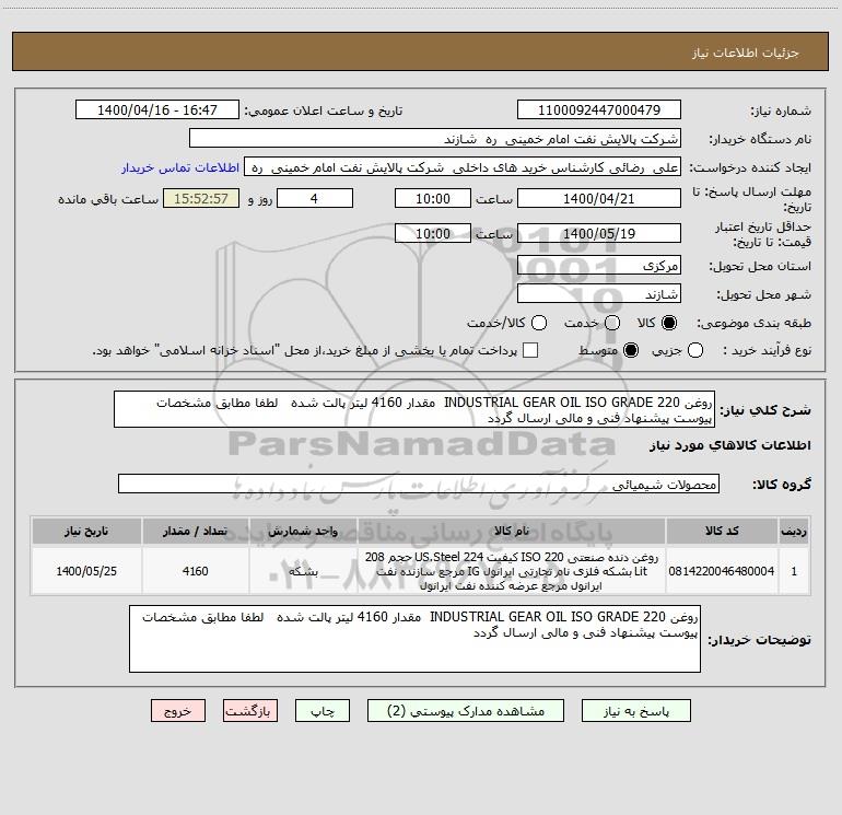 استعلام روغن INDUSTRIAL GEAR OIL ISO GRADE 220 مقدار 4160 لیتر پالت شده لطفا مطابق مشخصات پیوست پیشنهاد فنی و مالی ارسال گردد, استعلام روغن INDUSTRIAL GEAR OIL ISO GRADE 220 مقدار 4160 لیتر پالت شده لطفا مطابق مشخصات پیوست پیشنهاد فنی و مالی ارسال گردد