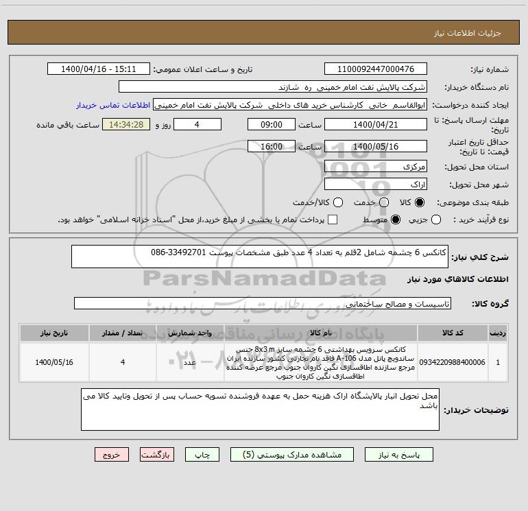 شرح کلی نیاز: کانکس 6 چشمه شامل 2قلم به تعداد 4 عدد طبق مشخصات پیوست 33492701-086
