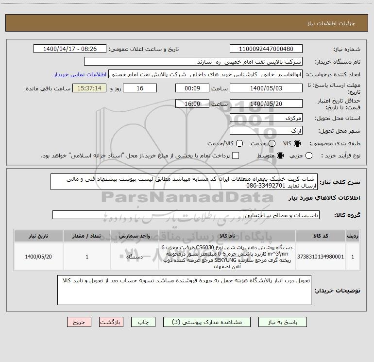 شرح کلی نیاز: شات کریت خشک بهمراه متعلقات ایران کد مشابه میباشد مطابق لیست پیوست پیشنهاد فنی و مالی ارسال نماید 33492701-086