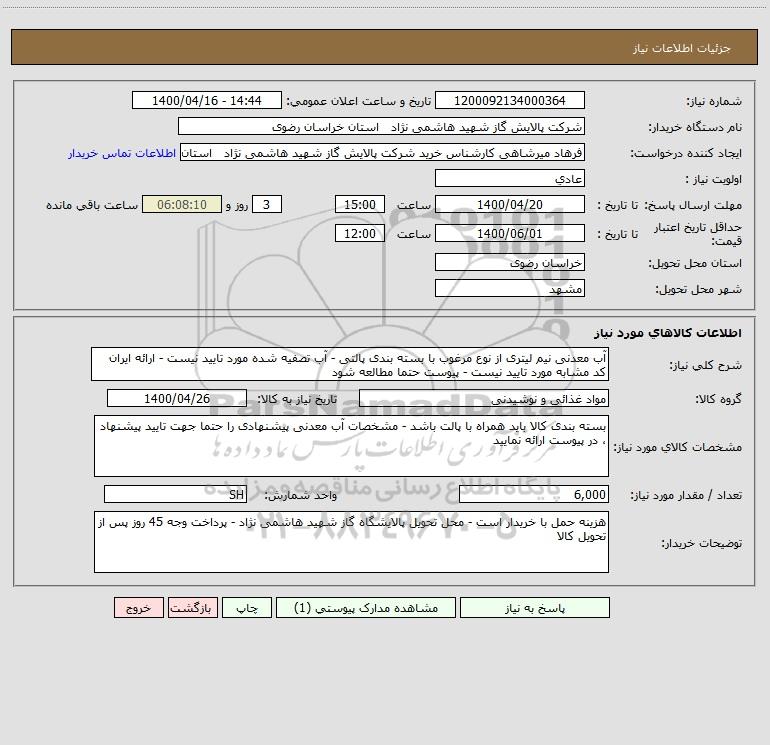 نام دستگاه خریدار:شرکت پالایش گاز شهید هاشمی نژاد استان خراسان رضوی