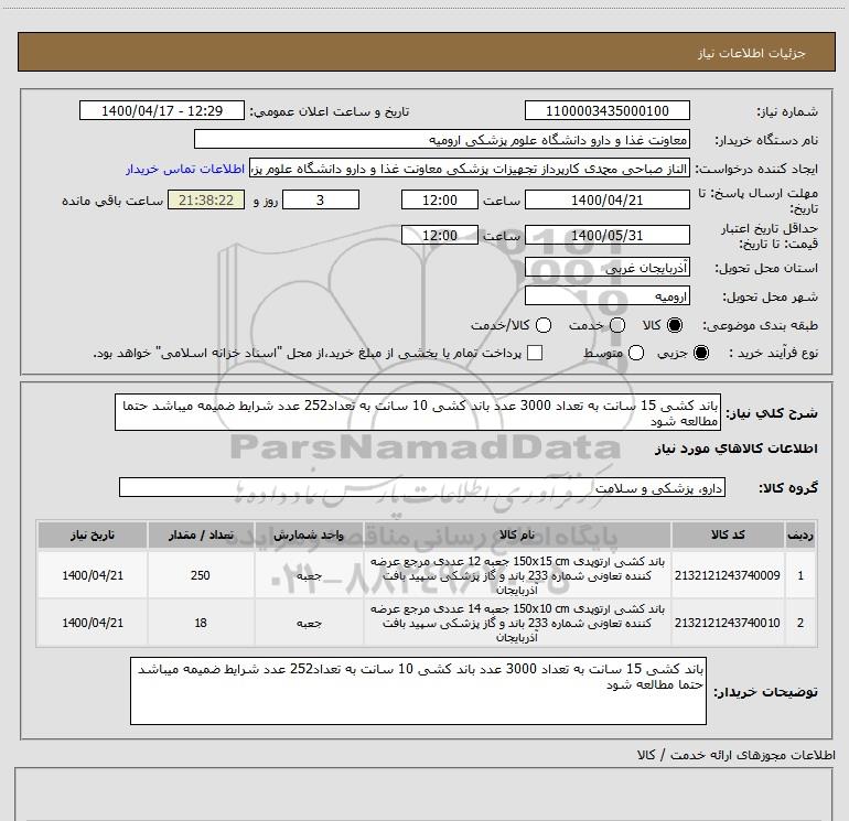 شرح کلی نیاز: باند کشی 15 سانت به تعداد 3000 عدد باند کشی 10 سانت به تعداد252 عدد شرایط ضمیمه میباشد حتما مطالعه شود