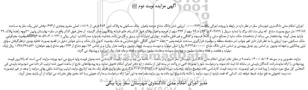 اجرای احکام مدنی دادگستری شهرستان سقز در نظر دارد در رابطه با پرونده اجرائی بکلاسه 0000273،  ارزیابی شش دانگ مشاع عرصه واعیان  ملک مسکونی به پلاک ثبتی 684 فرعی از 1819- اصلی مفروز ومجزی از674 -بخش ثبتی یک سقز به مساحت 122/89 متر مربع بصورت مشاع  که برابر سند تک برگ با شماره سریال ( 604899 ب 97 ) - 96 سهم از 336 سهم از عرصه و اعیان پلاک فوق الذکر بنام خانم فرشته یادگارپور صادر گردیده  از محل فوق الذکر واقع در سقز- بهارستان پایین –کوچه راهنما پلاک 29 -با موقعیت جغرافیایی utm(615052-4011240) بازدید بعمل آورده  وباستحضار می رساند: از مشخصات ملک سازه از مصالح سنتی و کاملاً فرسوده و کلنگی و غیر قابل سکونت -ودارای امتیازات آب و برق و گاز می باشد. باعنایت به موارد صدرالاشاره  ارزش ریالی ملک مسکونی مورد ارزیابی با مد نظر قرار دادن اهم جوانب امر منجمله منطقه و موقعیت قرارگیری مساحت عرصه معبر – دهنه – اعیانی کلنگی -نوع دسترسی به ملک وضعیت کنونی بازار ملک و سایر عوامل دخیل در قضیه بصورت تخلیه وبدون درنظرگرفتن سوابق ثبتی ومالکیتی و تعهدات ودیون  بر اساس ریز جدول پیوستی بر اساس شش دانگ مشاع 6.224.500.000 ریال( شش میلیارد و دویست و بیست وچهار میلیون و پانصد هزار ریال) و بر اساس 96 سهم مشاع از 336 سهم مشاع (سهم خواهان) 1.778.428.571 ریال (یک میلیارد و هفتصد و هفتاد و هشت میلیون و چهارصد و بیست و هشت میلیون و پانصد و هفتاد و یک هزار ریال ) برآورد و پیشنهاد می گردد.