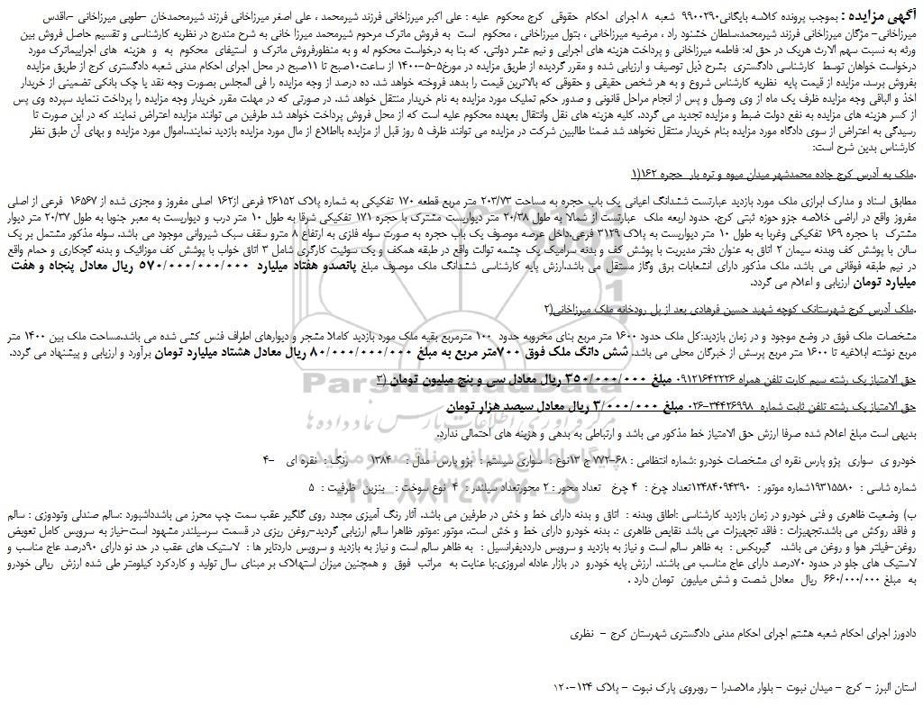 آگهی مزایده : بموجب پرونده کلاسه بایگانی9900290  شعبه  8 اجرای  احکام  حقوقی  کرج محکوم  علیه : علی اکبر میرزاخانی فرزند شیرمحمد ، علی اصغر میرزاخانی فرزند شیرمحمدخان -طوبی میرزاخانی -،اقدس میرزاخانی- مژگان میرزاخانی فرزند شیرمحمد،سلطان خشنود راد ، مرضیه میرزاخانی ، بتول میرزاخانی ، محکوم  است  به فروش ماترک مرحوم شیرمحمد میرزا خانی به شرح مندرج در نظریه کارشناسی و تقسیم حاصل فروش بین ورثه به نسبت سهم الارث هریک در حق له: فاطمه میرزاخانی و پرداخت هزینه های اجرایی و نیم عشر دولتی. که بنا به درخواست محکوم له و به منظورفروش ماترک و  استیفای  محکوم  به  و  هزینه  های اجراییماترک مورد درخواست خواهان توسط  کارشناسی دادگستری  بشرح ذیل توصیف و ارزیابی شده و مقرر گردیده از طریق مزایده در مورخ5-5-1400 از ساعت10صبح تا 11صبح در محل اجرای احکام مدنی شعبه دادگستری کرج از طریق مزایده بفروش برسد. مزایده از قیمت پایه  نظریه کارشناس شروع و به هر شخص حقیقی و حقوقی که بالاترین قیمت را بدهد فروخته خواهد شد. ده درصد از وجه مزایده را فی المجلس بصورت وجه نقد یا چک بانکی تضمینی از خریدار اخذ و الباقی وجه مزایده ظرف یک ماه از وی وصول و پس از انجام مراحل قانونی و صدور حکم تملیک مورد مزایده به نام خریدار منتقل خواهد شد. در صورتی که در مهلت مقرر خریدار وجه مزایده را پرداخت ننماید سپرده وی پس از کسر هزینه های مزایده به نفع دولت ضبط و مزایده تجدید می گردد. کلیه هزینه های نقل وانتقال بعهده محکوم علیه است که از محل فروش پرداخت خواهد شد طرفین می توانند مزایده اعتراض نمایند که در این صورت تا رسیدگی به اعتراض از سوی دادگاه مورد مزایده بنام خریدار منتقل نخواهد شد ضمنا طالبین شرکت در مزایده می توانند ظرف 5 روز قبل از مزایده بااطلاع از مال مورد مزایده بازدید نمایند..اموال مورد مزایده و بهای آن طبق نظر کارشناس بدین شرح است: