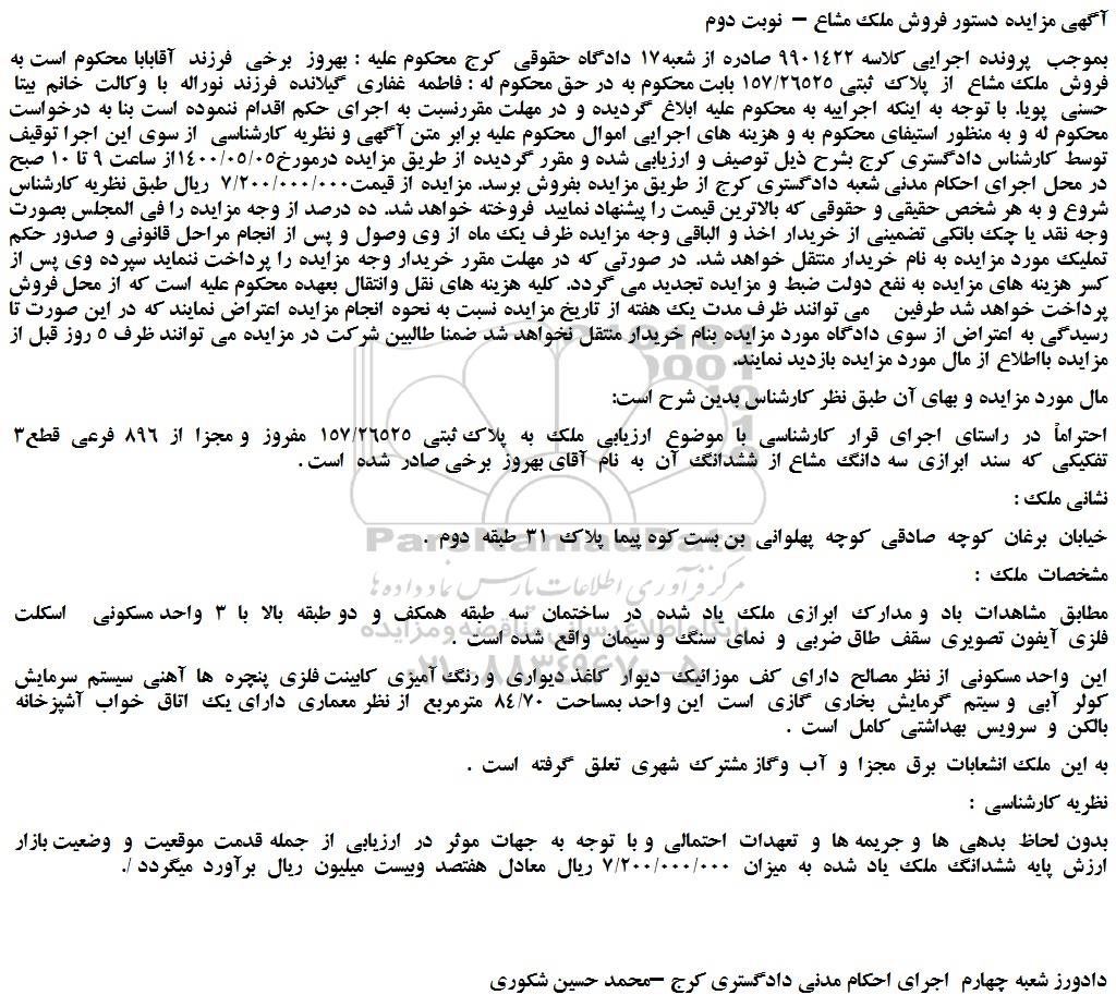 بموجب پرونده اجرایی کلاسه 9901422 صادره از شعبه17 دادگاه حقوقی کرج محکوم علیه : بهروز برخی فرزند آقابابا محکوم است به فروش ملک مشاع از پلاک ثبتی 157/26525 بابت محکوم به در حق محکوم له : فاطمه غفاری گیلانده فرزند نوراله با وکالت خانم بیتا حسنی پویا. با توجه به اینکه اجراییه به محکوم علیه ابلاغ گردیده و در مهلت مقررنسبت به اجرای حکم اقدام ننموده است بنا به درخواست محکوم له و به منظور استیفای محکوم به و هزینه های اجرایی اموال محکوم علیه برابر متن آگهی و نظریه کارشناسی از سوی این اجرا توقیف توسط کارشناس دادگستری کرج بشرح ذیل توصیف و ارزیابی شده و مقرر گردیده از طریق مزایده درمورخ1400/05/05از ساعت 9 تا 10 صبح در محل اجرای احکام مدنی شعبه دادگستری کرج از طریق مزایده بفروش برسد. مزایده از قیمت7/200/000/000 ریال طبق نظریه کارشناس شروع و به هر شخص حقیقی و حقوقی که بالاترین قیمت را پیشنهاد نمایید فروخته خواهد شد. ده درصد از وجه مزایده را فی المجلس بصورت وجه نقد یا چک بانکی تضمینی از خریدار اخذ و الباقی وجه مزایده ظرف یک ماه از وی وصول و پس از انجام مراحل قانونی و صدور حکم تملیک مورد مزایده به نام خریدار منتقل خواهد شد. در صورتی که در مهلت مقرر خریدار وجه مزایده را پرداخت ننماید سپرده وی پس از کسر هزینه های مزایده به نفع دولت ضبط و مزایده تجدید می گردد. کلیه هزینه های نقل وانتقال بعهده محکوم علیه است که از محل فروش پرداخت خواهد شد طرفین می توانند ظرف مدت یک هفته از تاریخ مزایده نسبت به نحوه انجام مزایده اعتراض نمایند که در این صورت تا رسیدگی به اعتراض از سوی دادگاه مورد مزایده بنام خریدار منتقل نخواهد شد ضمنا طالبین شرکت در مزایده می توانند ظرف 5 روز قبل از مزایده بااطلاع از مال مورد مزایده بازدید نمایند.