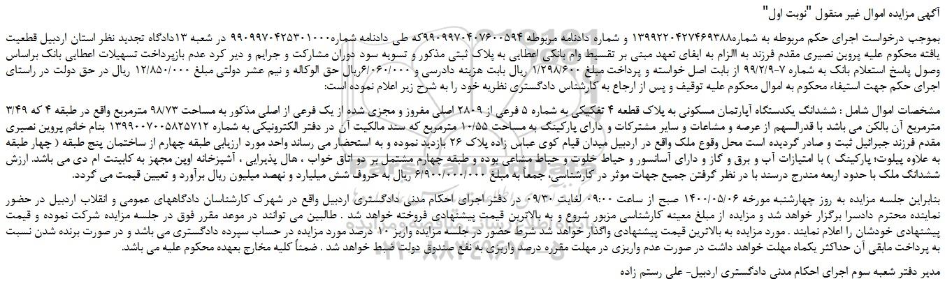 بموجب درخواست اجرای حکم مربوطه به شماره1399220427469388 و شماره دادنامه مربوطه 9909970407600594که طی دادنامه شماره9909970425301000 در شعبه 13دادگاه تجدید نظر استان اردبیل قطعیت یافته محکوم علیه پروین نصیری مقدم فرزند به االزام به ایفای تعهد مبنی بر تقسیط وام بانکی اعطایی به پلاک ثبتی مذکور و تسویه سود دوران مشارکت و جرایم و دیر کرد عدم بازپرداخت تسهیلات اعطایی بانک براساس وصول پاسخ استعلام بانک به شماره 7-99/2/9 از بابت اصل خواسته و پرداخت مبلغ 1/298/600 ریال بابت هزینه دادرسی و 6/060/000ریال حق الوکاله و نیم عشر دولتی مبلغ 12/850/000 ریال در حق دولت در راستای اجرای حکم جهت استیفاء محکوم به اموال محکوم علیه توقیف و پس از ارجاع به کارشناس دادگستری نظریه خود را به شرح زیر اعلام نموده است: