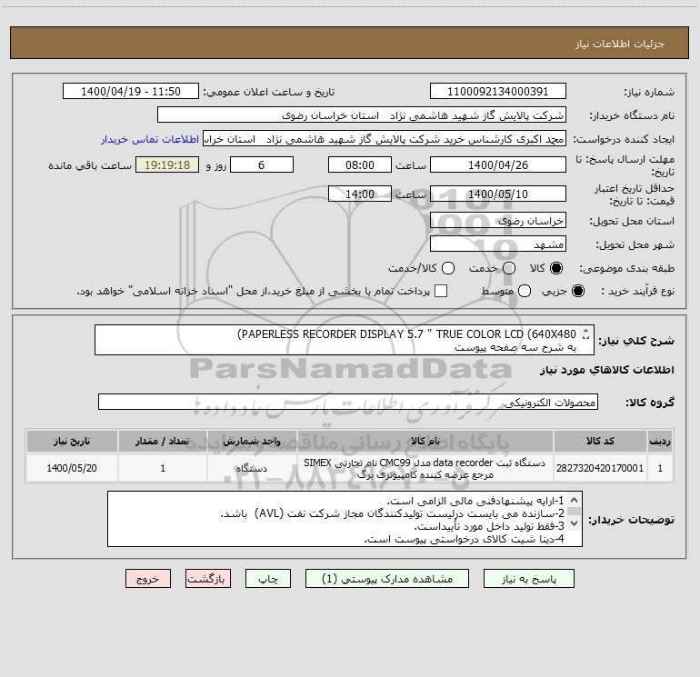 نام دستگاه خریدار:شرکت پالایش گاز شهید هاشمی نژاد استان خراسان رضوی