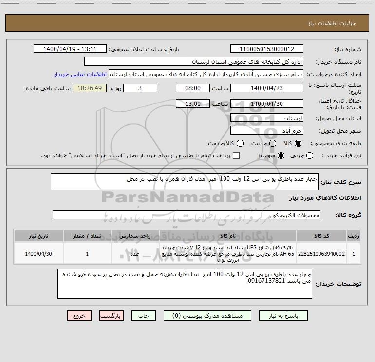 شرح کلی نیاز: چهار عدد باطری یو پی اس 12 ولت 100 امپر مدل فاران همراه با نصب در محل