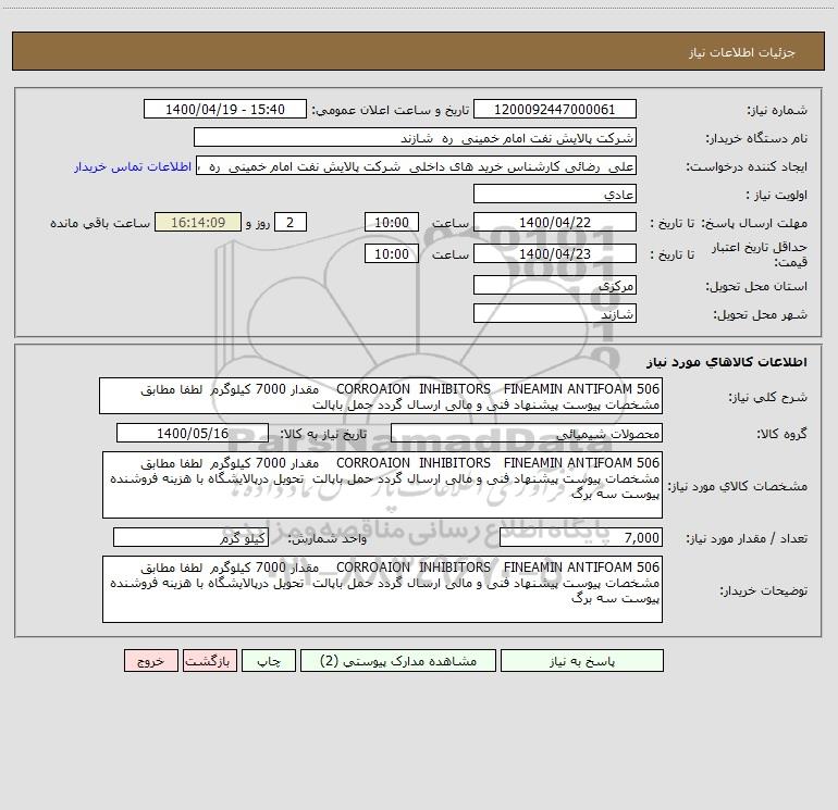 شرح کلی نیاز: CORROAION INHIBITORS FINEAMIN ANTIFOAM 506 مقدار 7000 کیلوگرم لطفا مطابق مشخصات پیوست پیشنهاد فنی و مالی ارسال گردد حمل باپالت