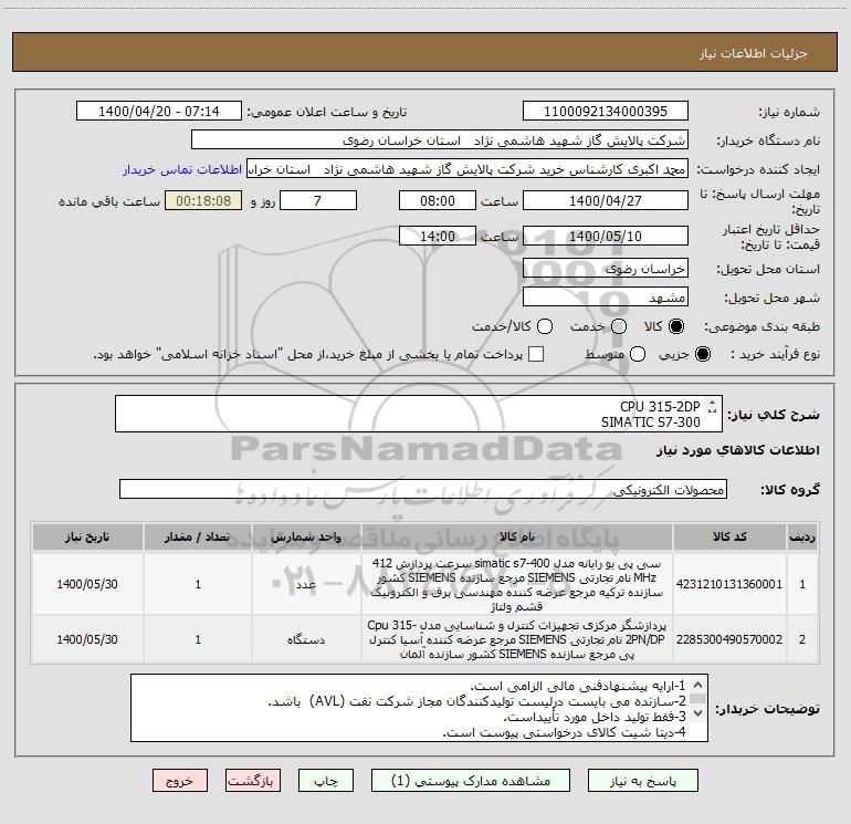 نام دستگاه خریدار:شرکت پالایش گاز شهید هاشمی نژاد استان خراسان رضوی