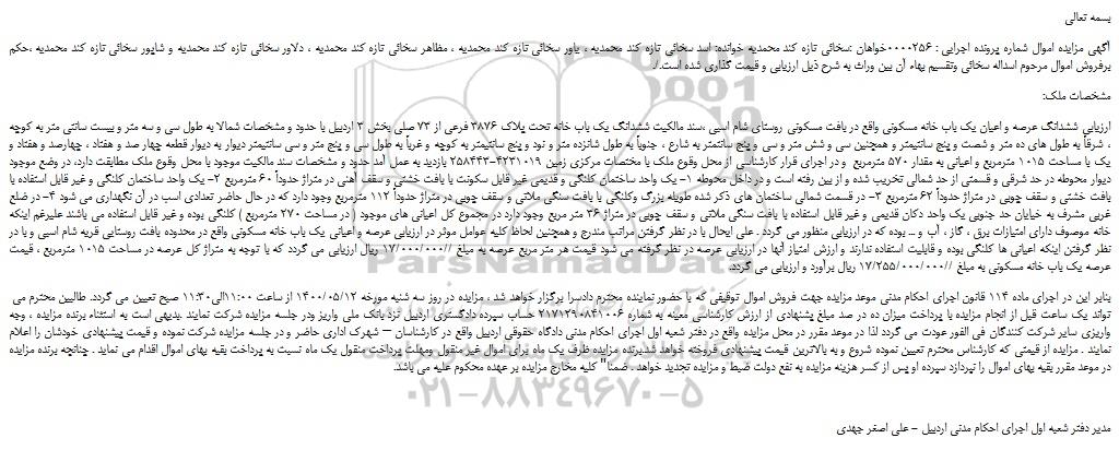 آگهی مزایده اموال شماره پرونده اجرایی : 0000256خواهان :سخائی تازه کند محمدیه خوانده: اسد سخائی تازه کند محمدیه ، یاور سخائی تازه کند محمدیه ، مظاهر سخائی تازه کند محمدیه ، دلاور سخائی تازه کند محمدیه و شاپور سخائی تازه کند محمدیه ،حکم برفروش اموال مرحوم اسداله سخائی وتقسیم بهاء آن بین وراث به شرح ذیل ارزیابی و قیمت گذاری شده است./.