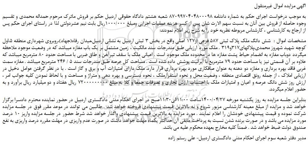 به موجب درخواست اجرای حکم به شماره دادنامه 8709970404800098 شعبه هشتم دادگاه حقوقی اردبیل حکم بر فروش ماترک مرحوم حمداله محمدی و تقسیم وجوه حاصله از فروش بین آنان به نسبت سهم الارث شان پس از کسر هزینه عملیات اجرایی ومبلغ 1000/000ریال بابت نیم عشردولتی لذا در راستای اجرای حکم پس از ارجاع به کارشناسی ، کارشناس مربوطه نظریه خود را به شرح زیر اعلام نمودند: