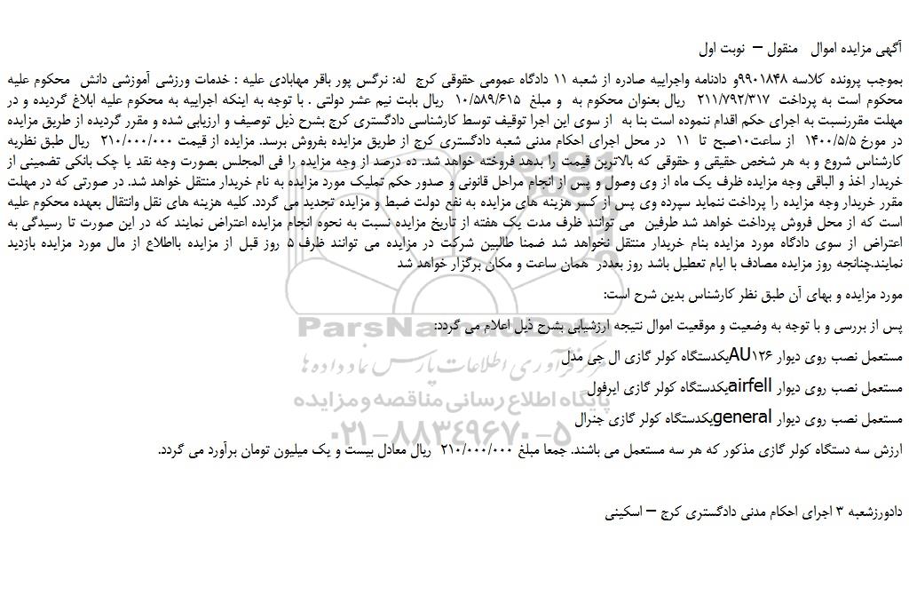 بموجب پرونده کلاسه 9901848و دادنامه واجراییه صادره از شعبه 11 دادگاه عمومی حقوقی کرج  له: نرگس پور باقر مهابادی علیه : خدمات ورزشی آموزشی دانش  محکوم علیه محکوم است به پرداخت  211/792/317  ریال بعنوان محکوم به  و مبلغ  10/589/615  ریال بابت نیم عشر دولتی . با توجه به اینکه اجراییه به محکوم علیه ابلاغ گردیده و در مهلت مقررنسبت به اجرای حکم اقدام ننموده است بنا به  از سوی این اجرا توقیف توسط کارشناسی دادگستری کرج بشرح ذیل توصیف و ارزیابی شده و مقرر گردیده از طریق مزایده در مورخ 1400/5/5  از ساعت10صبح تا  11  در محل اجرای احکام مدنی شعبه دادگستری کرج از طریق مزایده بفروش برسد. مزایده از قیمت 210/000/000  ریال طبق نظریه کارشناس شروع و به هر شخص حقیقی و حقوقی که بالاترین قیمت را بدهد فروخته خواهد شد. ده درصد از وجه مزایده را فی المجلس بصورت وجه نقد یا چک بانکی تضمینی از خریدار اخذ و الباقی وجه مزایده ظرف یک ماه از وی وصول و پس از انجام مراحل قانونی و صدور حکم تملیک مورد مزایده به نام خریدار منتقل خواهد شد. در صورتی که در مهلت مقرر خریدار وجه مزایده را پرداخت ننماید سپرده وی پس از کسر هزینه های مزایده به نفع دولت ضبط و مزایده تجدید می گردد. کلیه هزینه های نقل وانتقال بعهده محکوم علیه است که از محل فروش پرداخت خواهد شد طرفین  می توانند ظرف مدت یک هفته از تاریخ مزایده نسبت به نحوه انجام مزایده اعتراض نمایند که در این صورت تا رسیدگی به اعتراض از سوی دادگاه مورد مزایده بنام خریدار منتقل نخواهد شد ضمنا طالبین شرکت در مزایده می توانند ظرف 5 روز قبل از مزایده بااطلاع از مال مورد مزایده بازدید نمایند.چنانجه روز مزایده مصادف با ایام تعطیل باشد روز بعددر  همان ساعت و مکان برگزار خواهد شد