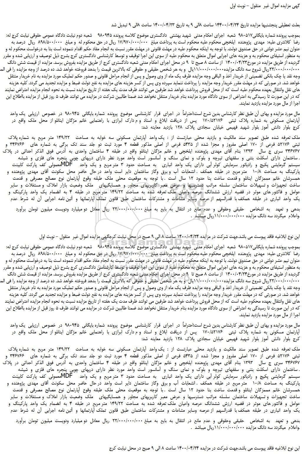 بموجب پرونده شماره بایگانی980517 شعبه اجرای احکام مدنی شهید بهشتی دادگستری موضوع کلاسه پرونده 980945 شعبه دوم نیابت دادگاه عمومی حقوقی نیابت کرج له: رضا کلانتری علیه: مهدی پژوهنده ایلخچی محکوم علیه محکوم است به پرداخت مبلغ 17/970/000/000 ریال در حق محکوم له و مبلغ 898/500/000 ریال درصد به عنوان نیم عشر دولتی در حق صندوق دولت. با توجه به اینکه محکوم علیه در مهلت قانونی در مهلت مقرر نسبت به انجام مفاد حکم اقدام ننموده است بنا به درخواست محکوم له و به منظور استیفای محکوم به و هزینه های اجرایی اموال متعلق به محکوم علیه از سوی این اجرا توقیف و توسط کارشناسی دادگستری کرج بشرح ذیل توصیف و ارزیابی شده و مقرر گردیده از طریق مزایده در مورخ1400/04/24 از ساعت 8 صبح تا 9 در محل اجرای احکام مدنی شعبه دادگستری کرج از طریق مزایده بفروش برسد. مزایده از قیمت شش دانگ 22/000/000/000ریال شروع سه دانگ مزایده11/000/000/000یال و به هر شخص حقیقی و حقوقی که بالاترین قیمت را بدهد فروخته خواهد شد. ده درصد از وجه مزایده را فی المجلس بصورت وجه نقد یا چک بانکی تضمینی از خریدار اخذ و الباقی وجه مزایده ظرف یک ماه از وی وصول و پس از انجام مراحل قانونی و صدور حکم تملیک مورد مزایده به نام خریدار منتقل خواهد شد. در صورتی که در مهلت مقرر خریدار وجه مزایده را پرداخت ننماید سپرده وی پس از کسر هزینه های مزایده به نفع دولت ضبط و مزایده تجدید می گردد. کلیه هزینه های نقل وانتقال بعهده محکوم علیه است که از محل فروش پرداخت خواهد شد طرفین می توانند ظرف مدت یک هفته از تاریخ مزایده نسبت به نحوه انجام مزایده اعتراض نمایند که در این صورت تا رسیدگی به اعتراض از سوی دادگاه مورد مزایده بنام خریدار منتقل نخواهد شد ضمنا طالبین شرکت در مزایده می توانند ظرف 5 روز قبل از مزایده بااطلاع این اجرا از مال مورد مزایده بازدید نمایند.