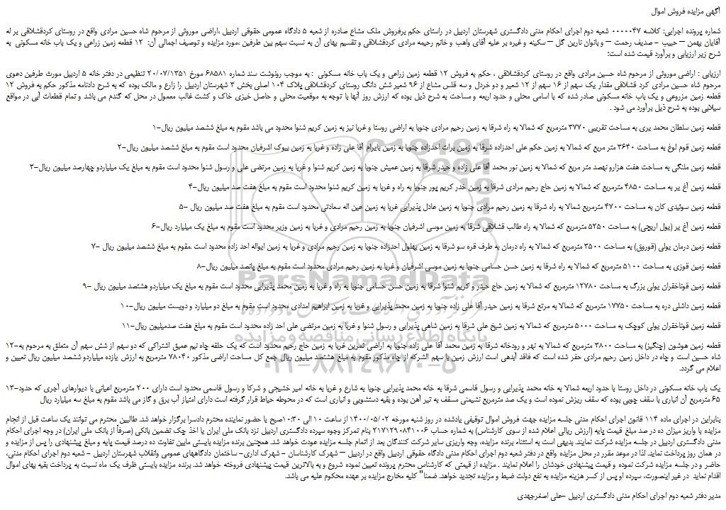 شماره پرونده اجرایی: کلاسه 0000047 شعبه دوم اجرای احکام مدنی دادگستری شهرستان اردبیل در راستای حکم برفروش ملک مشاع صادره از شعبه 5 دادگاه عمومی حقوقی اردبیل ،اراضی موروثی از مرحوم شاه حسین مرادی واقع در روستای کردقشلاقی بر له آقایان بهمن – حبیب - صدیف رحمت – و بانوان نارین گل – سکینه و غیره بر علیه آقای واهب و خانم رحیمه مرادی کردقشلاقی و تقسیم بهای آن به نسبت سهم بین طرفین ،مورد مزایده و توصیف اجمالی آن: 12 قطعه زمین زراعی و یک باب خانه مسکونی به شرح زیر ارزیابی و برآورد قیمت شده است؛