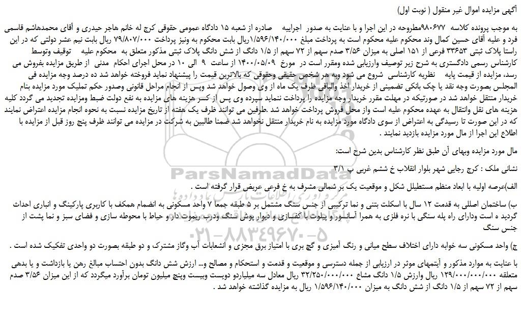 به موجب پرونده کلاسه  980677مطروحه در این اجرا و با عنایت به صدور  اجراییه    صادره از شعبه 15 دادگاه عمومی حقوقی کرج له خانم هاجر حیدری و آقای محمدهاشم قاسمی فرد و علیه آقای حسین کمال وند محکوم علیه محکوم است به پرداخت مبلغ 1/596/140/000ریال بابت محکوم به ونیز پرداخت 79/807/000 ریال بابت نیم عشر دولتی که در این راستا پلاک ثبتی 33653 فرعی از 151 اصلی به میزان 3/56 صدم سهم از 72 سهم از 1/5 دانگ از شش دانگ پلاک ثبتی مذکور متعلق به  محکوم علیه    توقیف وتوسط کارشناس رسمی دادگستری به شرح زیر توصیف وارزیابی شده ومقرر است در  مورخ  1400/05/09 از ساعت  9  الی 10 در محل اجرای احکام  مدنی  از طریق مزایده بفروش می رسد، مزایده از قیمت پایه    نظریه کارشناسی  شروع می شود وبه هر شخص حقیقی وحقوقی که بالاترین قیمت را پیشنهاد نماید فروخته خواهد شد ده درصد وجه مزایده فی المجلس بصورت وجه نقد یا چک بانکی تضمینی از خریدار اخذ والباقی ظرف یک ماه از وی وصول خواهد شد وپس از انجام مراحل قانونی وصدور حکم تملیک مورد مزایده بنام خریدار منتقل خواهد شد در صورتیکه در مهلت مقرر خریدار وجه مزایده را پرداخت ننماید سپرده وی پس از کسر هزینه های مزایده به نفع دولت ضبط ومزایده تجدید می گردد کلیه هزینه های نقل وانتقال به عهده محکوم علیه است واز محل فروش پرداخت خواهد شد .طرفین می توانند ظرف یک هفته از تاریخ مزایده نسبت به نحوه انجام مزایده اعتراض نمایند که در این صورت تا رسیدگی به اعتراض از سوی دادگاه مورد مزایده به نام خریدار منتقل نخواهد شد ضمنا طالبین به شرکت در مزایده می توانند ظرف پنج روز قبل از مزایده با اطلاع این اجرا از مال مورد مزایده بازدید نمایند .