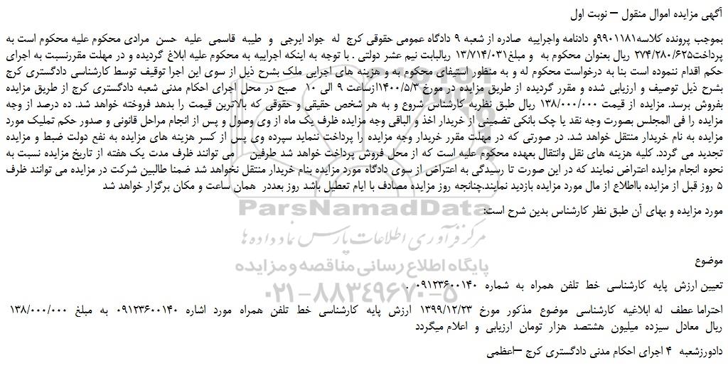 بموجب پرونده کلاسه9901181و دادنامه واجراییه صادره از شعبه 9 دادگاه عمومی حقوقی کرج له جواد ایرجی و طیبه قاسمی علیه حسن مرادی محکوم علیه محکوم است به پرداخت274/280/625 ریال بعنوان محکوم به و مبلغ13/714/031 ریالبابت نیم عشر دولتی . با توجه به اینکه اجراییه به محکوم علیه ابلاغ گردیده و در مهلت مقررنسبت به اجرای حکم اقدام ننموده است بنا به درخواست محکوم له و به منظور استیفای محکوم به و هزینه های اجرایی ملک بشرح ذیل از سوی این اجرا توقیف توسط کارشناسی دادگستری کرج بشرح ذیل توصیف و ارزیابی شده و مقرر گردیده از طریق مزایده در مورخ 1400/5/3ازساعت 9 الی 10 صبح در محل اجرای احکام مدنی شعبه دادگستری کرج از طریق مزایده بفروش برسد. مزایده از قیمت 138/000/000 ریال طبق نظریه کارشناس شروع و به هر شخص حقیقی و حقوقی که بالاترین قیمت را بدهد فروخته خواهد شد. ده درصد از وجه مزایده را فی المجلس بصورت وجه نقد یا چک بانکی تضمینی از خریدار اخذ و الباقی وجه مزایده ظرف یک ماه از وی وصول و پس از انجام مراحل قانونی و صدور حکم تملیک مورد مزایده به نام خریدار منتقل خواهد شد. در صورتی که در مهلت مقرر خریدار وجه مزایده را پرداخت ننماید سپرده وی پس از کسر هزینه های مزایده به نفع دولت ضبط و مزایده تجدید می گردد. کلیه هزینه های نقل وانتقال بعهده محکوم علیه است که از محل فروش پرداخت خواهد شد طرفین می توانند ظرف مدت یک هفته از تاریخ مزایده نسبت به نحوه انجام مزایده اعتراض نمایند که در این صورت تا رسیدگی به اعتراض از سوی دادگاه مورد مزایده بنام خریدار منتقل نخواهد شد ضمنا طالبین شرکت در مزایده می توانند ظرف 5 روز قبل از مزایده بااطلاع از مال مورد مزایده بازدید نمایند.چنانجه روز مزایده مصادف با ایام تعطیل باشد روز بعددر همان ساعت و مکان برگزار خواهد شد