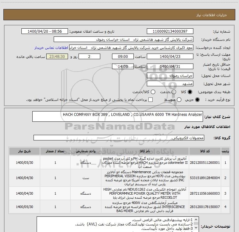 نام دستگاه خریدار:شرکت پالایش گاز شهید هاشمی نژاد استان خراسان رضوی