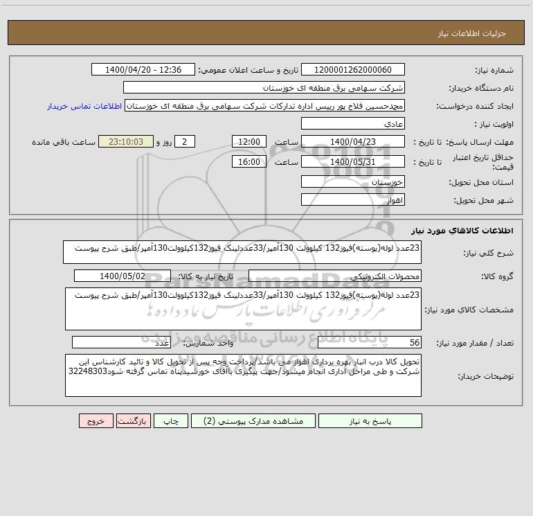 استعلام 23عدد لوله(پوسته)فیوز132 کیلوولت 130آمپر/33عددلینک فیوز132کیلوولت130آمپر/طبق شرح پیوست, استعلام 23عدد لوله(پوسته)فیوز132 کیلوولت 130آمپر/33عددلینک فیوز132کیلوولت130آمپر/طبق شرح پیوست