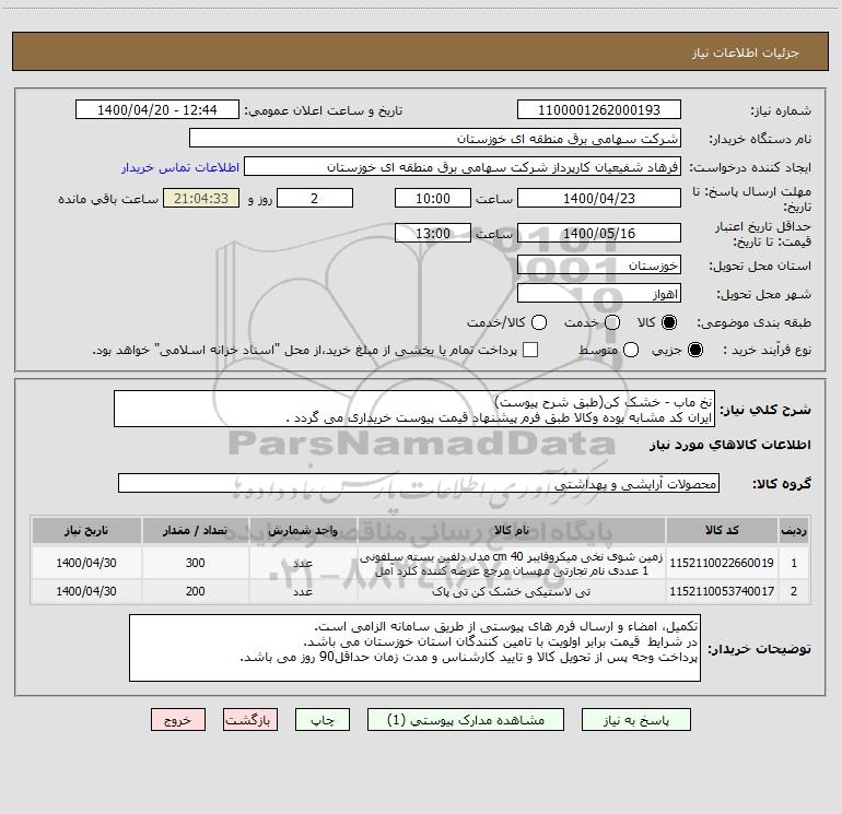 شرح کلی نیاز: نخ ماب - خشک کن(طبق شرح پیوست)