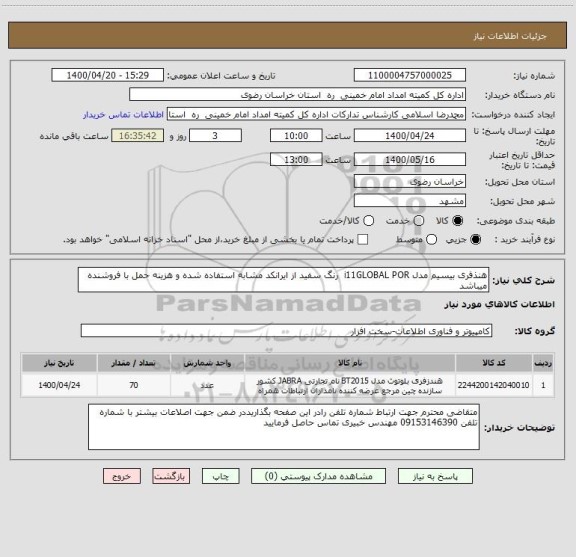 شرح کلی نیاز: هنذفری بیسیم مدل i11GLOBAL POR رنگ سفید از ایرانکد مشابه استفاده شده و هزینه حمل با فروشنده میباشد