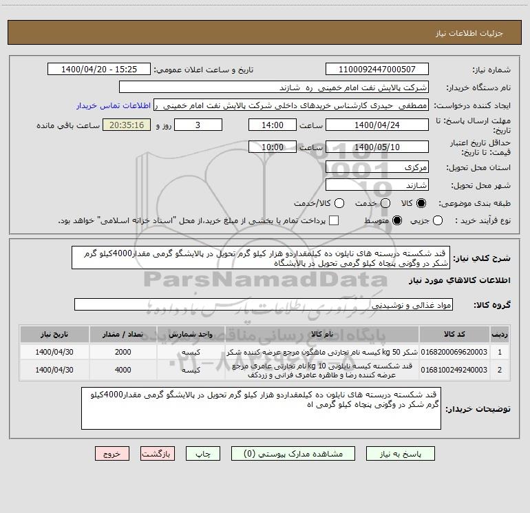 شرح کلی نیاز: قند شکسته دربسته های نایلون ده کیلمقداردو هزار کیلو گرم تحویل در پالایشگو گرمی مقدار4000کیلو گرم شکر در وگونی پنچاه کیلو گرمی تحویل در پالایشگاه