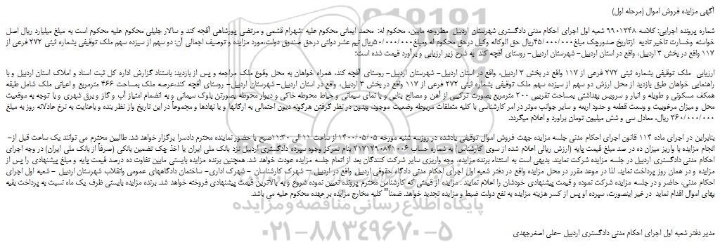 شماره پرونده اجرایی: کلاسه 9901348 شعبه اول اجرای احکام مدنی دادگستری شهرستان اردبیل مطروحه مابین، محکوم له: محمد ایمانی محکوم علیه :شهرام قشمی و مرتضی پورشاهی آقجه کند و سالار جلیلی محکوم علیه محکوم است به مبلغ میلیارد ریال اصل خواسته وخسارت تاخیر تادیه ازتاریخ صدورچک مبلغ45/000/000ریال حق الوکاله وکیل درحق محکوم له ومبلغ50/000/000ریال نیم عشر دولتی درحق صندوق دولت،مورد مزایده و توصیف اجمالی آن: دو سهم از سیزده سهم ملک توقیفی بشماره ثبتی 272 فرعی از 117 واقع در بخش 3 اردبیل، واقع در استان اردبیل- شهرستان اردبیل- روستای آقچه کند به شرح زیر ارزیابی و برآورد قیمت شده است؛