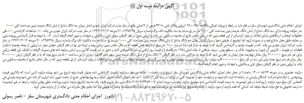 اجرای احکام مدنی دادگستری شهرستان سقز در نظر دارد در رابطه با پرونده اجرائی بکلاسه 9900751 ارزیابی پلاک ثبتی 3218 فرعی از 7 اصلی واقع در سقز جنب شرکت ایران خودرو شامل میزان سه دانگ مشاع از شش دانگ عرصه زمین بمساحت کلی 1000 متر خوانده پرونده دارای سه دانگ مشاع از شش دانگ عرصه زمین بمساحت کلی 1000 متر مر بع مستند به سند مالکیت تک برگ بشماره سریال 245225 د 91 مورخه 1392/12/12 در سقز جنب شرکت ایران خودرو می باشد . 1- مشاهدات کارشناسی : 1- طی تحقیقات اینجانب از بنگاهای مشاور املاک در بلوار کردستان از این قطعه زمین که در حال حاضر خارج از محدوده مسکونی می باشد و ارزیابی بدون در نظر گرفتن سوابق ثبتی و مالکیتی و تعهدات و دیون انجام گرفته است . 2- . با توجه به قرار کارشناسی پرونده مبنی بر معاینه دقیق محل متنازع فیه و در صورت لزوم اخذ توضیح از طرفین دعوا و میزان ارزش بهای سه دانگ مشاع از شش دانگ عرصه زمین بمساحت کلی 1000 متر مر بع مستند به سند مالکیت تک برگ بشماره سریال 245225 د 91 مورخه 1392/12/12 در سقز جنب شرکت ایران خودرو می باشد .که در طبیعت بازدید و کارشناسی گردید که با توجه به متراژ قید شده در سند 1000 متر مربع و شرایط فعلی قطعه که در حال حاضر زمین زراعی بوده و دورتا دور وبا در نظر گرفتن عوامل موثر در ارزیابی از جمله وضعیت استقرار قطعات در طبیعت ، کاربری آن (دیم ) و مرغوبیت خاک و ، مسطح بودن ، و بعد مسافتی تا جاده اصلی (135 متر فاصله ) و قیمت روز اراضی و سایر فاکتورهای لازم و دخیل در امر قیمت گذاری و بر اساس مبایعه نامه های صورت گرفته در اطراف این قطعه زراعی برای هر متر مربع 4000000 ریال معادل چهارصد هزار تومان در نظر می شود که با توجه به متراژاین سند و در نظر گرفتن 3 دانگ مشاع از شش دانگ عرصه زمین سهم خانم گلاویژ درباری از این مساحت 500 متر مربع بوده که با در نظر گرفتن ارزش 4000000 ریال برای هر متر مربع جمعا برای این سند در کل مبلغ 2000000000(دو میلیارد ریال ) معادل دویست میلیون تومان برآورد می گردد.طی تحقیقات اینجانب از بنگاهای مشاور املاک در بلوار کردستان از این قطعه زمین که در حال حاضر خارج از محدوده مسکونی می باشد و ارزیابی بدون در نظر گرفتن سوابق ثبتی و مالکیتی و تعهدات و دیون انجام گرفته است .