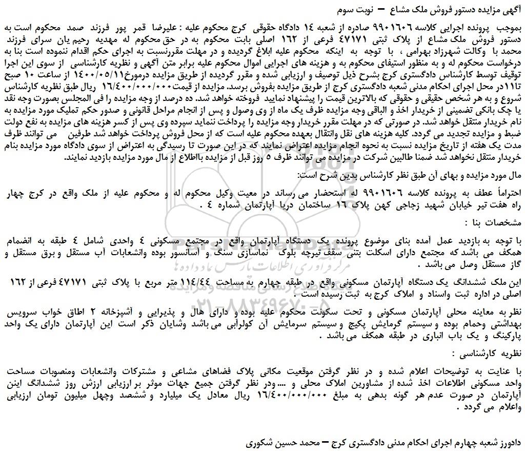 بموجب پرونده اجرایی کلاسه 9901606 صادره از شعبه 14 دادگاه حقوقی کرج محکوم علیه : علیرضا قمر پور فرزند صمد محکوم است به دستور فروش ملک مشاع از پلاک ثبتی 47171 فرعی از 162 اصلی بابت محکوم به در حق محکوم له مهدیه رحیم یان سرای فرزند محمد با وکالت شهرزاد بهرامی ، با توجه به اینکه محکوم علیه ابلاغ گردیده و در مهلت مقررنسبت به اجرای حکم اقدام ننموده است بنا به درخواست محکوم له و به منظور استیفای محکوم به و هزینه های اجرایی اموال محکوم علیه برابر متن آگهی و نظریه کارشناسی از سوی این اجرا توقیف توسط کارشناس دادگستری کرج بشرح ذیل توصیف و ارزیابی شده و مقرر گردیده از طریق مزایده درمورخ1400/05/11 از ساعت 10 صبح تا11در محل اجرای احکام مدنی شعبه دادگستری کرج از طریق مزایده بفروش برسد. مزایده از قیمت16/400/000/000 ریال طبق نظریه کارشناس شروع و به هر شخص حقیقی و حقوقی که بالاترین قیمت را پیشنهاد نمایید فروخته خواهد شد. ده درصد از وجه مزایده را فی المجلس بصورت وجه نقد یا چک بانکی تضمینی از خریدار اخذ و الباقی وجه مزایده ظرف یک ماه از وی وصول و پس از انجام مراحل قانونی و صدور حکم تملیک مورد مزایده به نام خریدار منتقل خواهد شد. در صورتی که در مهلت مقرر خریدار وجه مزایده را پرداخت ننماید سپرده وی پس از کسر هزینه های مزایده به نفع دولت ضبط و مزایده تجدید می گردد. کلیه هزینه های نقل وانتقال بعهده محکوم علیه است که از محل فروش پرداخت خواهد شد طرفین می توانند ظرف مدت یک هفته از تاریخ مزایده نسبت به نحوه انجام مزایده اعتراض نمایند که در این صورت تا رسیدگی به اعتراض از سوی دادگاه مورد مزایده بنام خریدار منتقل نخواهد شد ضمنا طالبین شرکت در مزایده می توانند ظرف 5 روز قبل از مزایده بااطلاع از مال مورد مزایده بازدید نمایند.