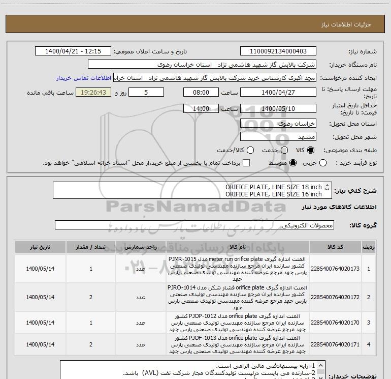 شرح کلی نیاز: ORIFICE PLATE, LINE SIZE 18 inch
