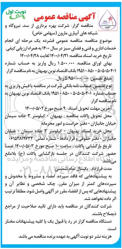 مناقصه گزار: شرکت بهره برداری از سد، نیروگاه و شبکه های آبیاری مارون (سهامی خاص)