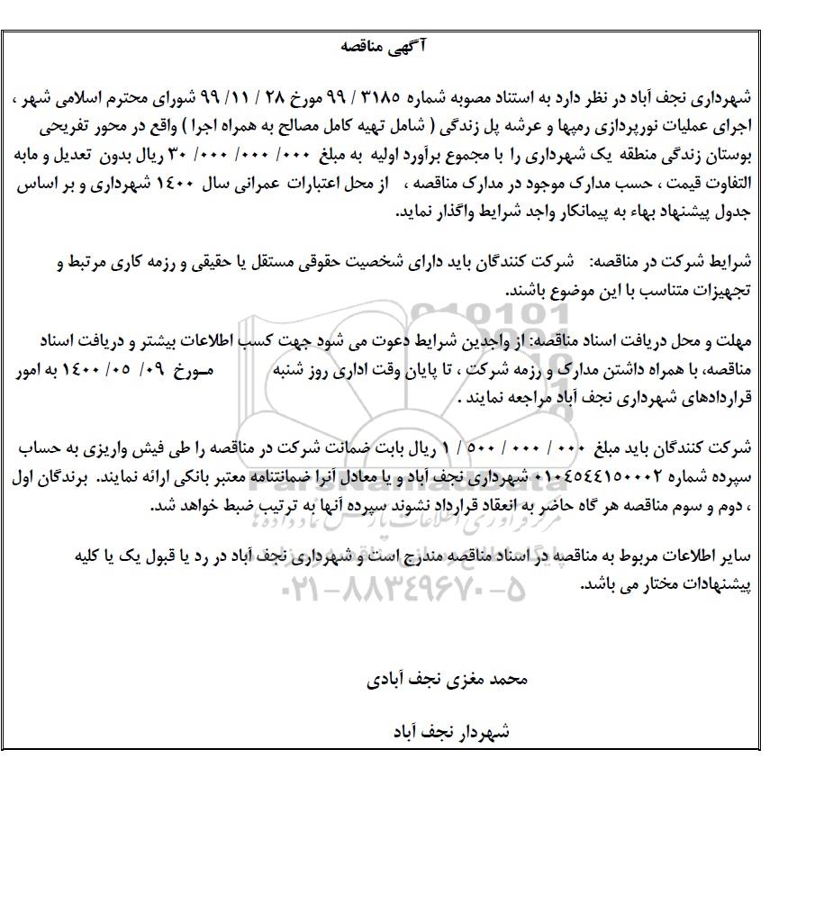 شهرداری نجف آباد به استناد مصوبه شماره 99/3185 مورخ 99.11.28 شورای محترم اسلامی،  اجرای عملیات نورپردازی رمپها و عرشه پل زندگی (شامل تهیه کامل مصالح به همراه اجرا) واقع در محور تفریحی بوستان زندگی منطقه یک شهرداری را با مجموع برآورد اولیه به مبلغ 30.000.000.000 ریال بدون تعدیل و مابه التفاوت قیمت حسب مدارک موجود در مناقصه از محل اعتبارات عمرانی سال 1400 شهرداری و براساس جدول پیشنهاد بها به پیمانکار واجد شرایط واگذار نماید