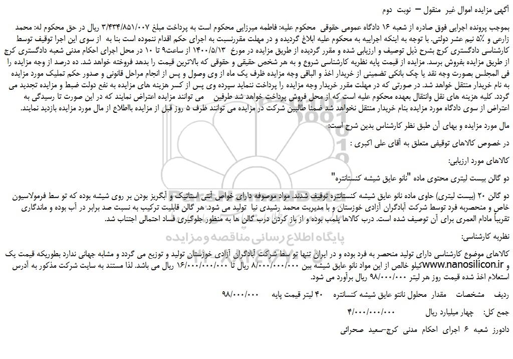 مزایده عمومی مزایده فروش دو گالن بیست لیتری محتوی ماده "نانو عایق شیشه کنستانتره" برگزار میگردد. از کلیه افراد متخصص و شرکت‌های واجد شرایط دعوت به عمل می‌آید تا در این مزایده با کد خبرگزاری پارس نماد : 3582971 شرکت نمایند تاریخ شروع مزایده : 1400/04/21 مهلت شرکت در مزایده: تا پایان روز 1400/05/13 مکان برگزاری اموال واگذاری استان‌های البرز و دسته‌بندی‌های مربوط به این حراجی مواد شیمیایی میباشد.