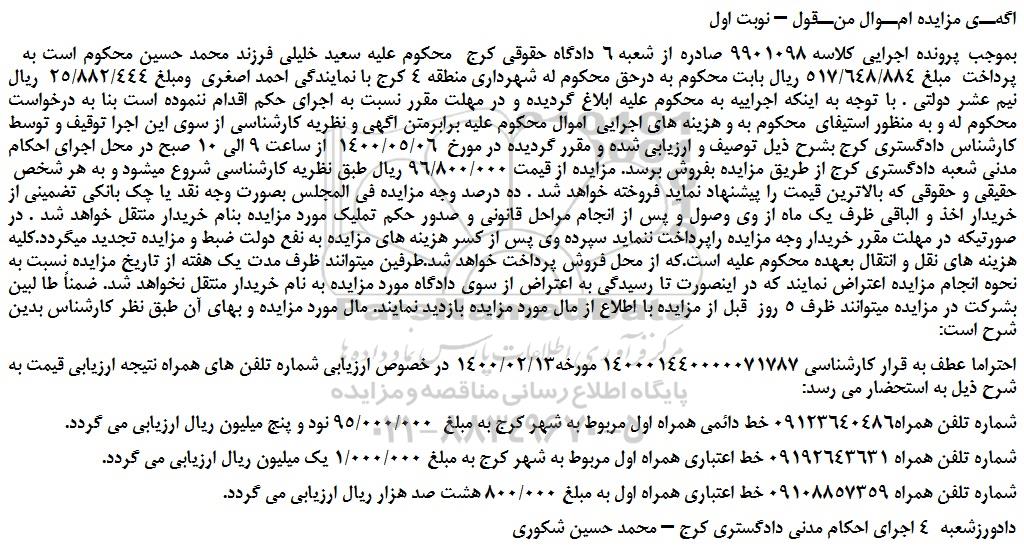 بموجب پرونده اجرایی کلاسه 9901098 صادره از شعبه 6 دادگاه حقوقی کرج محکوم علیه سعید خلیلی فرزند محمد حسین محکوم است به پرداخت مبلغ 517/648/884 ریال بابت محکوم به درحق محکوم له شهرداری منطقه 4 کرج با نمایندگی احمد اصغری ومبلغ 25/882/444 ریال نیم عشر دولتی . با توجه به اینکه اجراییه به محکوم علیه ابلاغ گردیده و در مهلت مقرر نسبت به اجرای حکم اقدام ننموده است بنا به درخواست محکوم له و به منظور استیفای محکوم به و هزینه های اجرایی اموال محکوم علیه برابرمتن اگهی و نظریه کارشناسی از سوی این اجرا توقیف و توسط کارشناس دادگستری کرج بشرح ذیل توصیف و ارزیابی شده و مقرر گردیده در مورخ 1400/05/06 از ساعت 9 الی 10 صبح در محل اجرای احکام مدنی شعبه دادگستری کرج از طریق مزایده بفروش برسد. مزایده از قیمت 96/800/000 ریال طبق نظریه کارشناسی شروع میشود و به هر شخص حقیقی و حقوقی که بالاترین قیمت را پیشنهاد نماید فروخته خواهد شد . ده درصد وجه مزایده فی المجلس بصورت وجه نقد یا چک بانکی تضمینی از خریدار اخذ و الباقی ظرف یک ماه از وی وصول و پس از انجام مراحل قانونی و صدور حکم تملیک مورد مزایده بنام خریدار منتقل خواهد شد . در صورتیکه در مهلت مقرر خریدار وجه مزایده راپرداخت ننماید سپرده وی پس از کسر هزینه های مزایده به نفع دولت ضبط و مزایده تجدید میگردد.کلیه هزینه های نقل و انتقال بعهده محکوم علیه است.که از محل فروش پرداخت خواهد شد.طرفین میتوانند ظرف مدت یک هفته از تاریخ مزایده نسبت به نحوه انجام مزایده اعتراض نمایند که در اینصورت تا رسیدگی به اعتراض از سوی دادگاه مورد مزایده به نام خریدار منتقل نخواهد شد. ضمناً طا لبین بشرکت در مزایده میتوانند ظرف 5 روز قبل از مزایده با اطلاع از مال مورد مزایده بازدید نمایند. مال مورد مزایده و بهای آن طبق نظر کارشناس بدین شرح است: