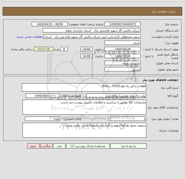 نام دستگاه خریدار:شرکت پالایش گاز شهید هاشمی نژاد استان خراسان رضوی