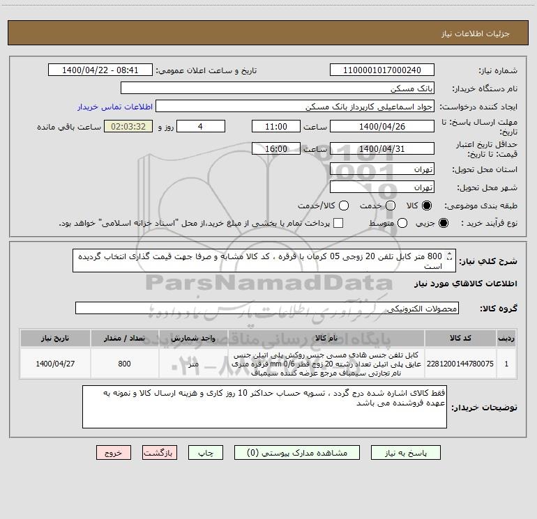 شرح کلی نیاز: 800 متر کابل تلفن 20 زوجی 05 کرمان با قرقره ، کد کالا مشابه و صرفا جهت قیمت گذاری انتخاب گردیده است