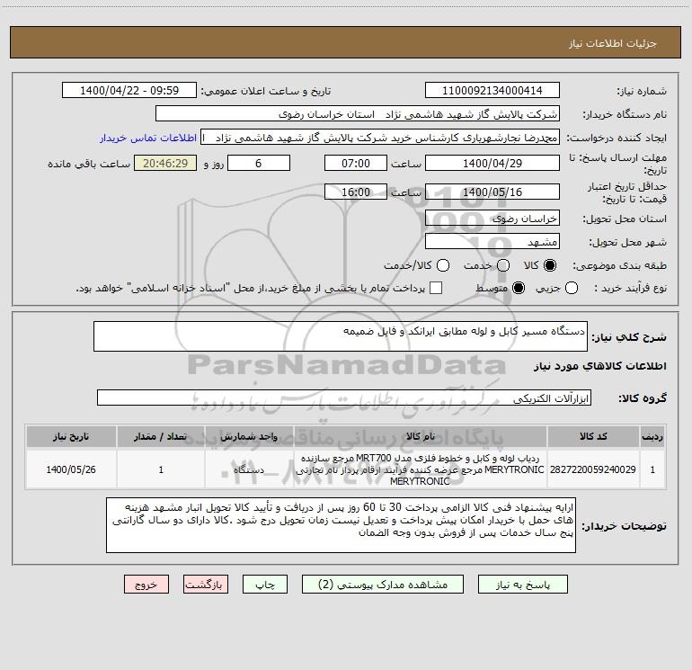نام دستگاه خریدار:شرکت پالایش گاز شهید هاشمی نژاد استان خراسان رضوی