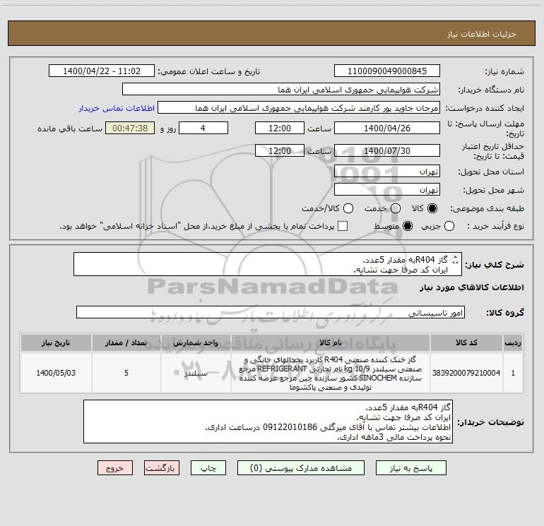 توضیحات خریدار:گاز R404به مقدار 5عدد. ایران کد صرفا جهت تشابه. اطلاعات بیشتر تماس با آقای میرگلی 09122010186 درساعت اداری. نحوه پرداخت مالی 3ماهه اداری.