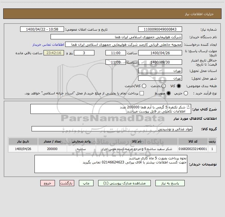 شرح کلی نیاز: شکر تکنفره 5 گرمی با آرم هما 200000 عدد