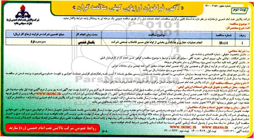 شرکت پالایش نفت امام خمینی (ره) شازند در نظر دارد به استناد قانون برگزاری مناقصات انجام خدمات ذیل را از طریق مناقصه عمومی یک مرحله ای به پیمانکار واجد شرایط واگذار نماید.