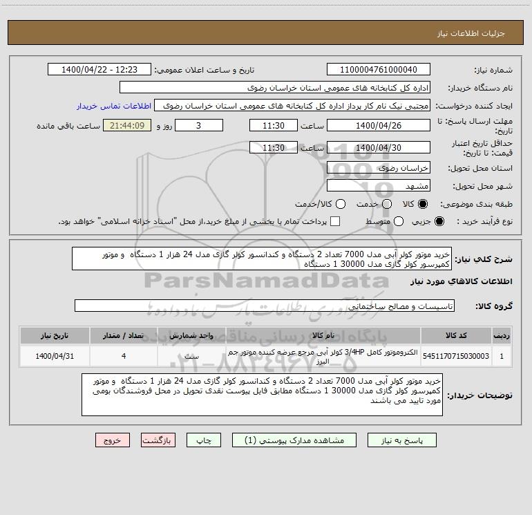 شرح کلی نیاز: خرید موتور کولر آبی مدل 7000 تعداد 2 دستگاه و کندانسور کولر گازی مدل 24 هزار 1 دستگاه و موتور کمپرسور کولر گازی مدل 30000 1 دستگاه