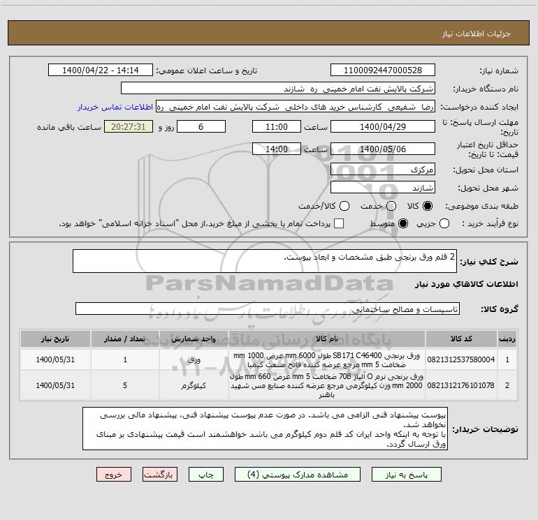 شرح کلی نیاز: 2 قلم ورق برنجی طبق مشخصات و ابعاد پیوست.