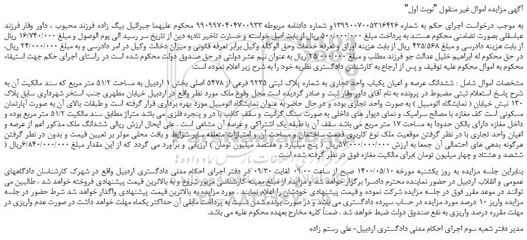 "آگهی مزایده اموال غیر منقول "نوبت اول