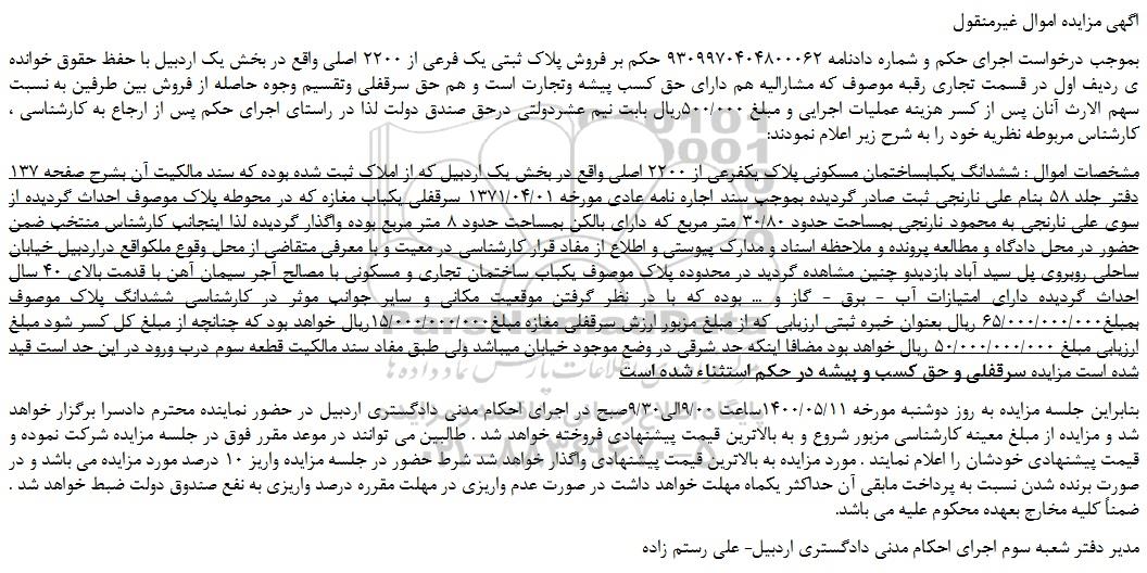 بموجب درخواست اجرای حکم و شماره دادنامه 9309970404800062 حکم بر فروش پلاک ثبتی یک فرعی از 2200 اصلی واقع در بخش یک اردبیل با حفظ حقوق خوانده ی ردیف اول در قسمت تجاری رقبه موصوف که مشارالیه هم دارای حق کسب پیشه وتجارت است و هم حق سرقفلی وتقسیم وجوه حاصله از فروش بین طرفین به نسبت سهم الارث آنان پس از کسر هزینه عملیات اجرایی و مبلغ 500/000ریال بابت نیم عشردولتی درحق صندق دولت لذا در راستای اجرای حکم پس از ارجاع به کارشناسی ، کارشناس مربوطه نظریه خود را به شرح زیر اعلام نمودند: