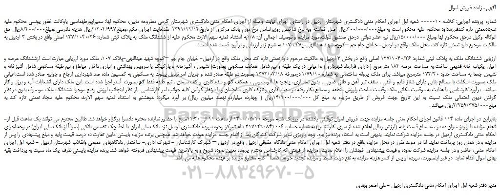 شماره پرونده اجرایی: کلاسه 0000010 شعبه اول اجرای احکام مدنی دادگستری شهرستان اردبیل در راستای اجرای نیابت واصله از اجرای احکام مدنی دادگستری شهرستان گرمی مطروحه مابین، محکوم لها: سمیراپورطهماسبی باوکالت غفور یونسی محکوم علیه :سجادنعمتی تازه کندفرزندداود محکوم علیه محکوم است به مبلغ300/000/000ریال اصل خواسته وبه نرخ شاخص روزبراساس نرخ تورم بانک مرکزی از تاریخ1391/11/14 عقدلغایت اجرای حکم ،ومبلغ2/204/997ریال هزینه دادرسی ومبلغ8/400/000ریال حق الوکاله وکیل درحق محکوم لها ومبلغ 15/000/000ریال نیم عشر دولتی درحق صندوق دولت،مورد مزایده و توصیف اجمالی آن: 1/8به استثناء ثمنیه سهم الارث محکوم علیه از ششدانگ ملک به پلاک ثبتی شماره: 127/1040/26 اصلی واقع در بخش 3 اردبیل به مالکیت مرحوم داود نعمتی تازه کند، محل ملک واقع در اردبیل- خیابان جام جم –کوچه شهید عبداللهی-پلاک 107 به شرح زیر ارزیابی و برآورد قیمت شده است؛