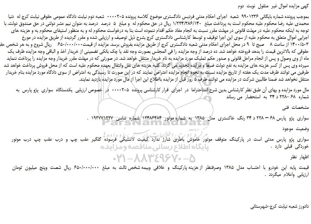 مال مورد مزایده و بهای آن طبق نظر کارشناس بدین شرح استاحتراما  در  اجرای  قرار کارشناسی پرونده  0000205  در  خصوص ارزیابی  یکدستگاه  سواری  پژو پارس  به  شماره  68 -228 د 34  به  استحضار  می رساند