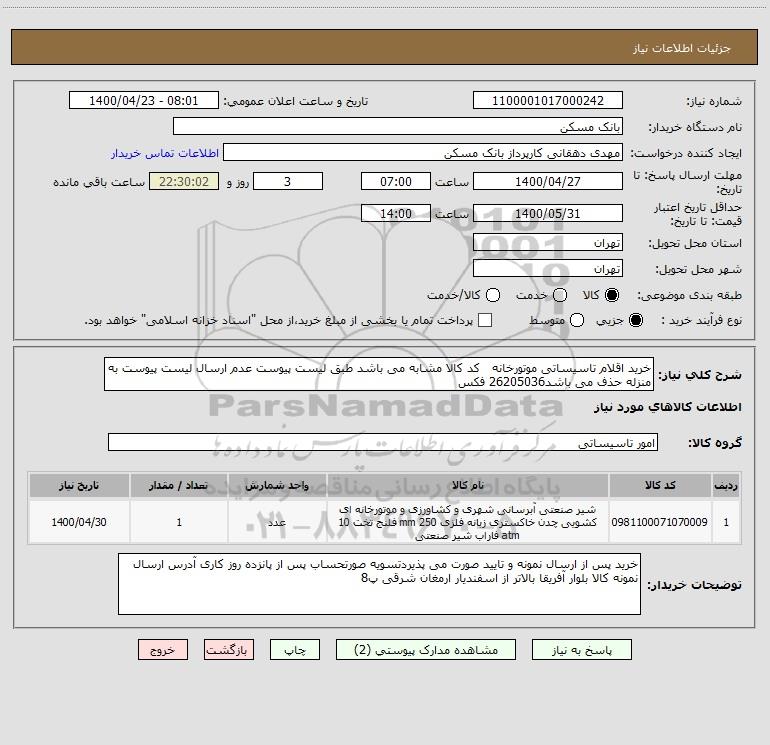 شرح کلی نیاز: خرید اقلام تاسیساتی موتورخانه کد کالا مشابه می باشد طبق لیست پیوست عدم ارسال لیست پیوست به منزله حذف می باشد26205036 فکس