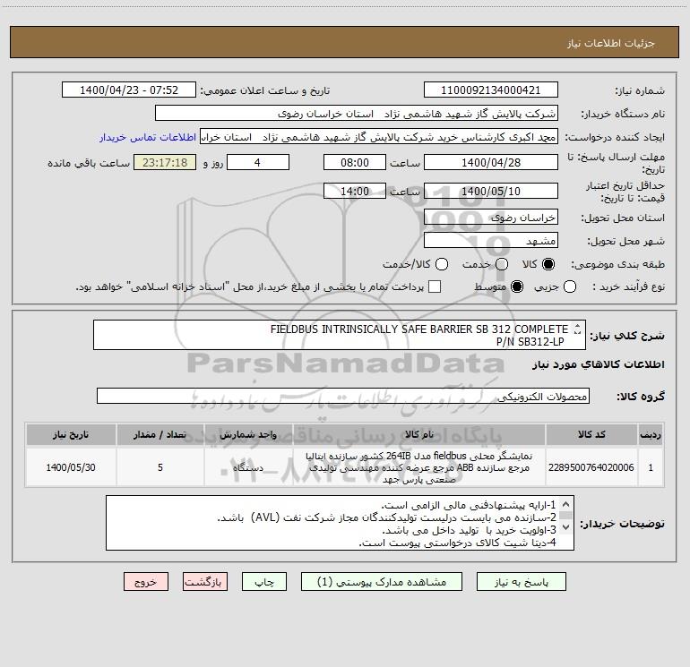 نام دستگاه خریدار:شرکت پالایش گاز شهید هاشمی نژاد استان خراسان رضوی