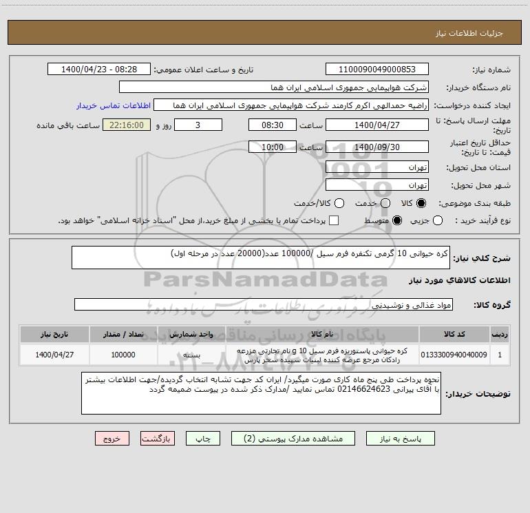 شرح کلی نیاز: کره حیوانی 10 گرمی تکنفره فرم سیل /100000 عدد(20000 عدد در مرحله اول)