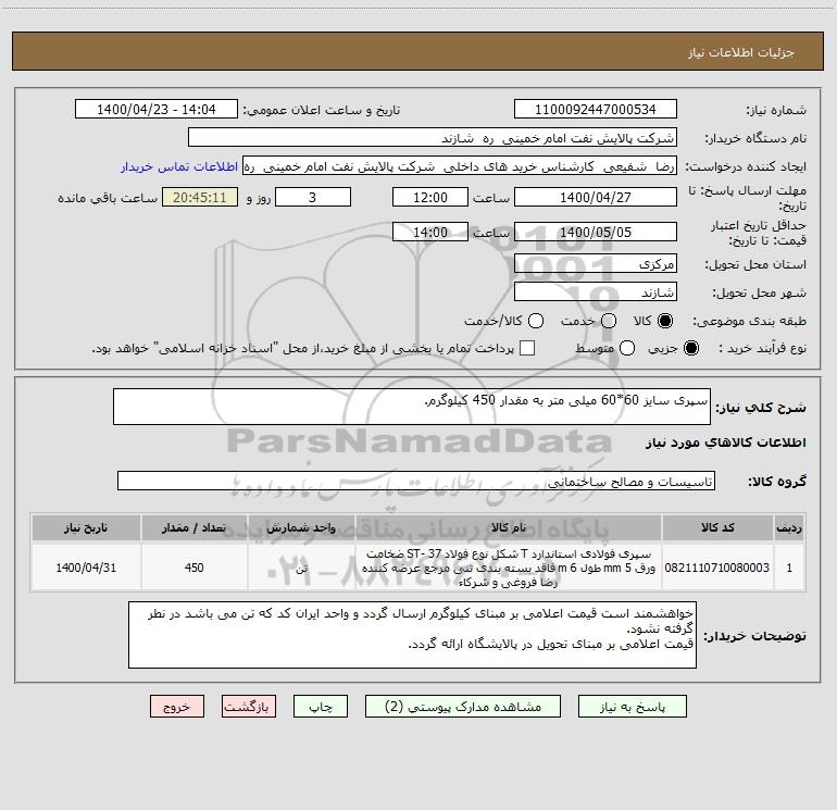 استعلام سپری سایز 60*60 میلی متر به مقدار 450 کیلوگرم., استعلام سپری سایز 60*60 میلی متر به مقدار 450 کیلوگرم.