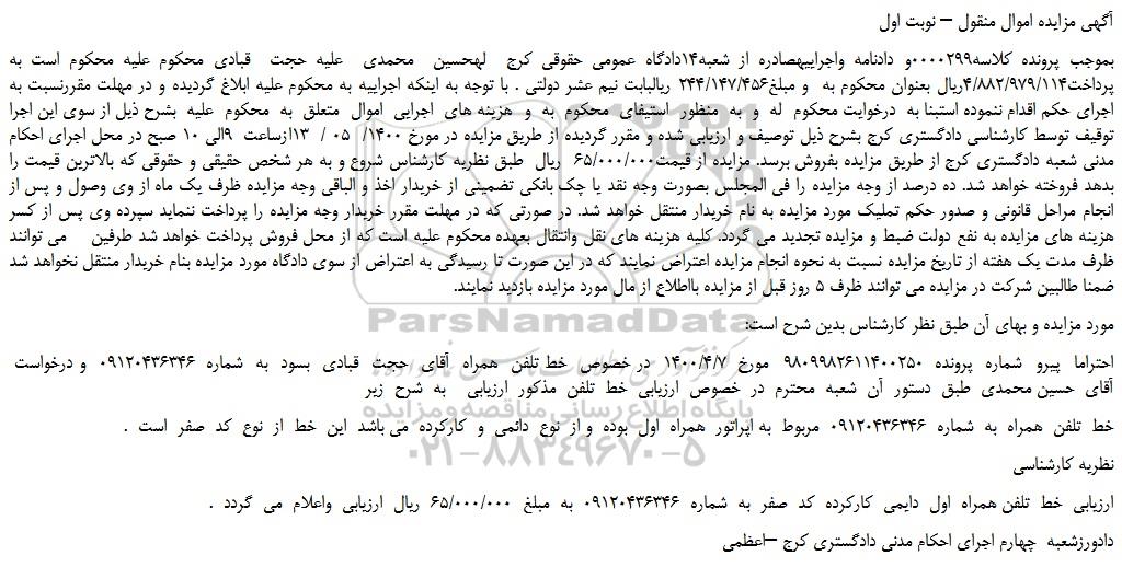 بموجب پرونده کلاسه0000299و دادنامه واجراییهصادره از شعبه14دادگاه عمومی حقوقی کرج لهحسین محمدی علیه حجت قبادی محکوم علیه محکوم است به پرداخت4/882/979/114ریال بعنوان محکوم به و مبلغ244/147/456 ریالبابت نیم عشر دولتی . با توجه به اینکه اجراییه به محکوم علیه ابلاغ گردیده و در مهلت مقررنسبت به اجرای حکم اقدام ننموده استبنا به درخوایت محکوم له و به منظور استیفای محکوم به و هزینه های اجرایی اموال متعلق به محکوم علیه بشرح ذیل از سوی این اجرا توقیف توسط کارشناسی دادگستری کرج بشرح ذیل توصیف و ارزیابی شده و مقرر گردیده از طریق مزایده در مورخ 1400/ 05 / 13ازساعت 9الی 10 صبح در محل اجرای احکام مدنی شعبه دادگستری کرج از طریق مزایده بفروش برسد. مزایده از قیمت65/000/000 ریال طبق نظریه کارشناس شروع و به هر شخص حقیقی و حقوقی که بالاترین قیمت را بدهد فروخته خواهد شد. ده درصد از وجه مزایده را فی المجلس بصورت وجه نقد یا چک بانکی تضمینی از خریدار اخذ و الباقی وجه مزایده ظرف یک ماه از وی وصول و پس از انجام مراحل قانونی و صدور حکم تملیک مورد مزایده به نام خریدار منتقل خواهد شد. در صورتی که در مهلت مقرر خریدار وجه مزایده را پرداخت ننماید سپرده وی پس از کسر هزینه های مزایده به نفع دولت ضبط و مزایده تجدید می گردد. کلیه هزینه های نقل وانتقال بعهده محکوم علیه است که از محل فروش پرداخت خواهد شد طرفین می توانند ظرف مدت یک هفته از تاریخ مزایده نسبت به نحوه انجام مزایده اعتراض نمایند که در این صورت تا رسیدگی به اعتراض از سوی دادگاه مورد مزایده بنام خریدار منتقل نخواهد شد ضمنا طالبین شرکت در مزایده می توانند ظرف 5 روز قبل از مزایده بااطلاع از مال مورد مزایده بازدید نمایند.